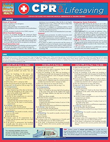 Making the decision to help in an emergency situation is often a difficult choice. Be prepared for emergencies with the help of our CPR & Lifesaving QuickStudy® guide. Packed with quickly accessible information on different aspects of lifesaving, this go-to reference will help you respond effectively in an emergency until professional help arrives. Learn how to evaluate a scene, the steps in CPR and AED use, standard precautions, and other essential elements in the chain of survival. This durable, laminated guide also includes illustrations for easy understanding. Keep a copy in your home, with your camping gear, at your office, in your car, etc., so that you will always be prepared.From reader reviews: